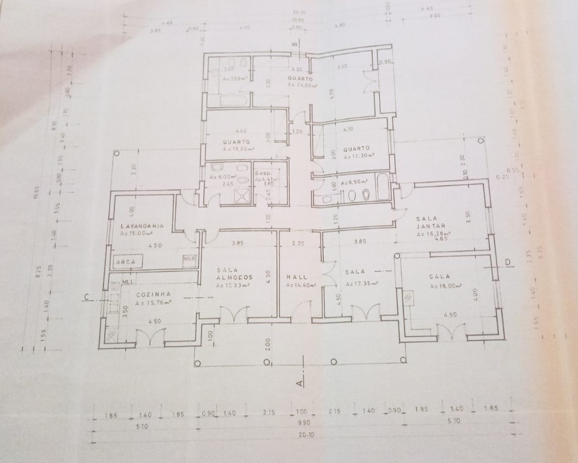 Moradia térrea com 377 m² de área bruta e 282m² de área útil. Espaçosa e confortável, a casa possui 5 quartos, sendo 1 deles suíte com closet, 3 wc, cozinha com sala de jantar, salão com lareira, hall de entrada e zona de circulação com teto falso.